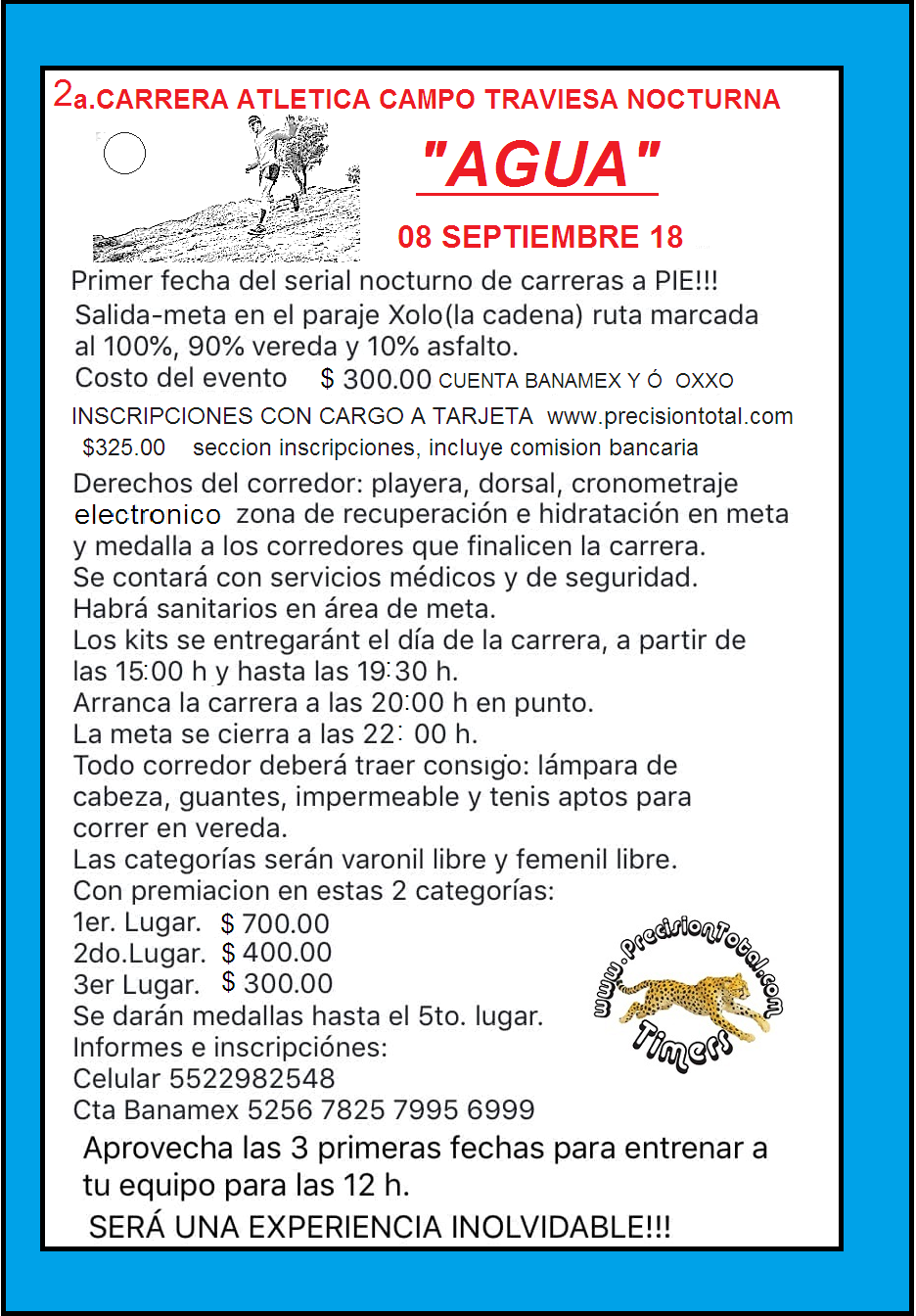 2a. CORRIENDO DE NOCHE EN LA SIERRA DE GUADALUPE “AGUA”08 SEPTIEMBRE16 julio, 2018 / 2018 ¡Inscríbete ahora a tu evento!