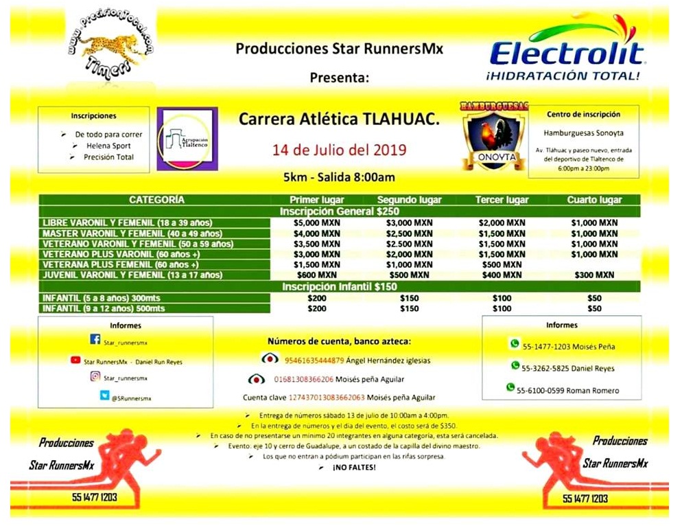 CARRERA ATLETICA 5K “TLAHUAC” $5,000.00 , 14 JULIO 2019