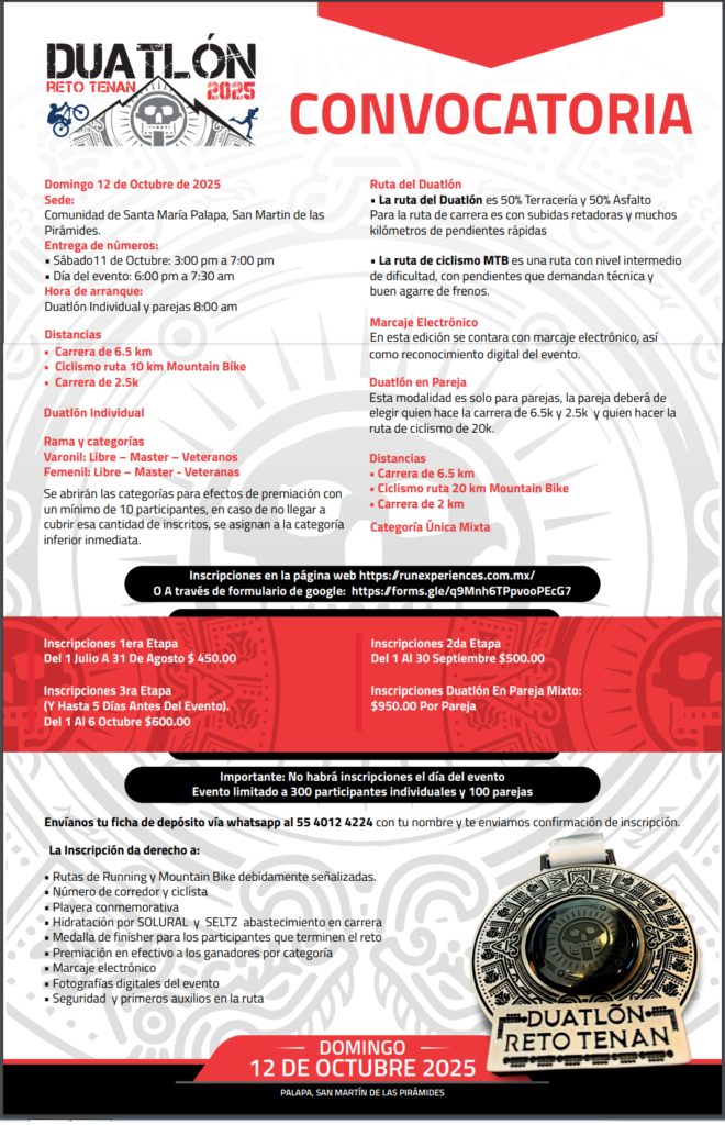 DUATLON RETO TENAN 2025- SANTA MARIA PALAPA-SAN MARTIN DE LAS PIRAMIDES* DOMINGO 12 OCTUBRE 2025 CORRE 6.5K BICI 10KM MOUNTAIN BIKE Y CIERRA CORRIENDO 2.5KMS INDIVIDUAL Y EN PAREJAS CORRE 6.5K RUEDA 20KM Y CULMINAN CORRIENDO 2KM *** RUTA 50% ASFALTO 50% TERRACERIA