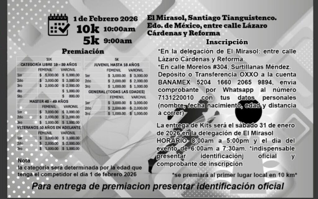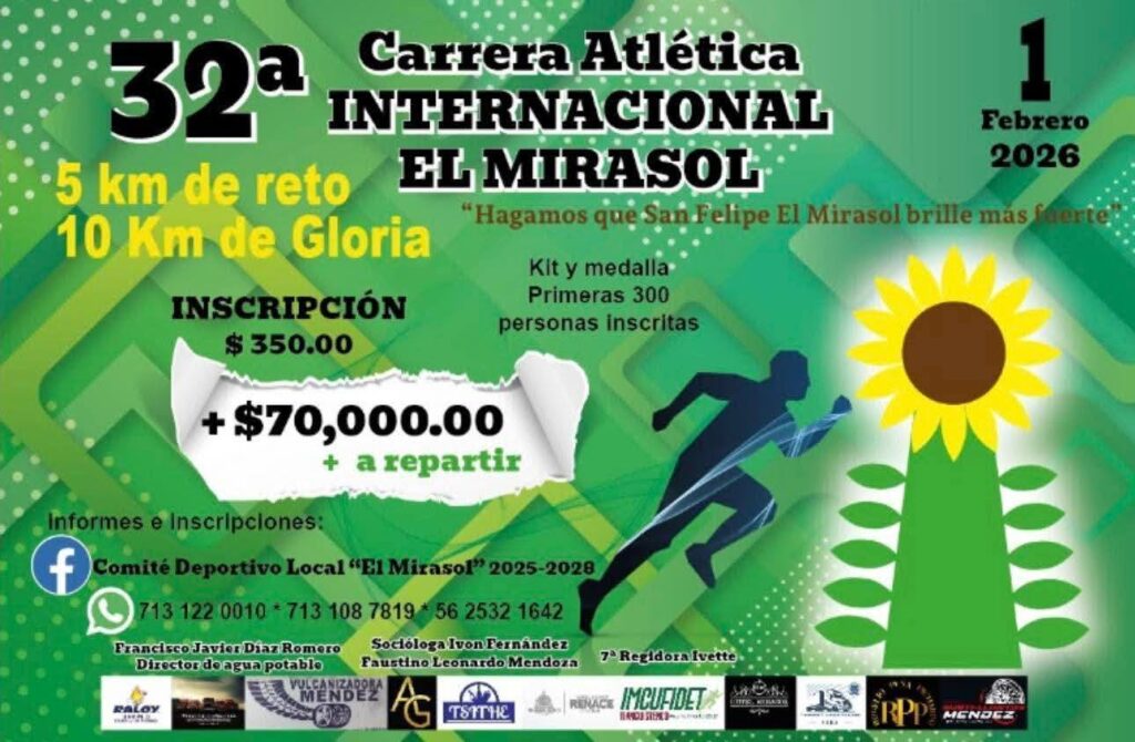 32a. CARRERA ATLETICA INTERNACIONAL 5K Y 10K EL MIRASOL *** 01 FEBRERO 2026 SAN FELIPE EL MIRASOL A 20 MIN DE LA MARQUESA14 enero, 2026 / 2026, Eventos, Sin categoría ¡Inscríbete ahora a tu evento!